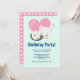 A birthday party invitation with an adorable graphic illustration. A white kitty cat with a cute paw print on her leg. Sleeping peacefully. A big pink heart behind her and some little stars too.