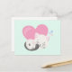 A postcard with an adorable graphic illustration. A white kitty cat with a cute paw print image on her fur. Sleeping peacefully. A big pink heart behind her and some little stars too. Mint green background.