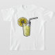 What would you do without a sweet glass of lemonade in the summer? This glass of lemonade has a lemon wedged onto the side of the glass, a straw that has been bent at its top, and a cold ice cube that will cool down the whole glass.