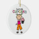 A stick figure brunette girl with a big pink frosted cupcake and colourful text that reads Sweet Little Cupcake on an ornament that's perfect for the tree or can be used all year!