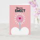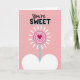 This greeting card features a soft pastel pink background that feels gentle and romantic, like a quiet blush behind a sweet note 🥰. Near the top, the text reads “You’re Sweet,” with “You’re” in smooth, flowing red lettering and “SWEET” in all-caps red letters edged with a light blue shadow. Centered below the words is a candy-like flower that looks like a lollipop turned into a sunflower, drawing your eye like a little token of affection ❤️. Its round face is made of concentric pink and white rings, surrounded by crisp white petal rays that radiate outward. In the middle sits a deep red heart, giving the design a tender, love-forward focal point without needing any extra characters. A slim pastel blue stem drops down from the flower to the bottom area, where two soft white cloud shapes sit symmetrically at the lower edge. The overall look stays flat and graphic, with the blue shadow on the top text and the red heart standing out against the pale pink field.