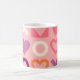 This coffee mug features a playful, hand-drawn repeating pattern of hearts, 'O's (hugs), and 'X's (kisses) in a delightful, modern color palette. The soft pink background is complemented by shades of lavender, deep plum, bright pink, cream, and warm orange.