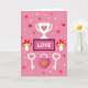 This Valentine's Day card shows a pink background filled with small white sparkles and tiny heart details that make the scene feel sweet and romantic 💕. In the center, there’s a bright white trophy with a pink-and-yellow heart on the front, like love is the top prize. Just below it, a framed sign says “LOVE” in simple, easy-to-read letters, with a dark magenta border around the word. On each side of the sign, two red mushrooms sit like little decorations, each topped with white heart spots. At the bottom, a pink heart-shaped padlock with a golden keyhole rests between two white keys, and each key has a heart shape at the top. The colors stay mostly pink, red, and white, keeping everything focused on romance and caring ❤️. Share it with someone special and let them know you’re thinking of them this Valentine’s Day 😘.