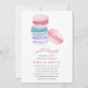 Oh la la! These sweet baby shower invitations feature a stack of delectable French macarons in pastel handpainted watercolor shades of blush pink, aqua and lavender. Personalise with your baby shower details beneath in pink and grey lettering. A lovely choice for dessert, French or Paris-themed baby showers for sweet baby girls on the way. Invitations reverse to solid blush pink.