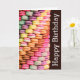 A tower of colourful macarons displayed artfully in a bakery window. The front says Happy Birthday, the inside text says Hope your birthday is so sweet it makes you dizzy. You can personalise it with your own words if desired. This is a fun card to give to someone who has a love of this meringue confection.