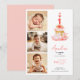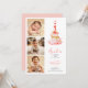This sweet modern 1st birthday invitation features a clean and elegant layout. The design combines three baby photos on one side with a soft pink floral cake illustration on the other. The number “1” cake graphic highlights the first birthday in a simple and charming way. Soft pastel pink tones create a warm and joyful feel.