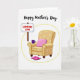 This card shows a cozy digital illustration centered on a plush golden-yellow armchair with faint floral detailing, like a favorite seat saved for someone you adore ❤️. A bright pink cushion sits snugly in the chair, adding a sweet, affectionate accent that feels like a gentle hug. A deep purple mug rests on the arm, suggesting a shared pause for tea and quiet conversation. Below the chair, a matching pair of pink slippers is set neatly in place, as if waiting for a caring mom to slip into them. A dashed yellow line loops around the chair, slippers, and mug, forming a little “you-time” circle that feels lovingly protected. Near the lower right, a small sign reads “COMFORT ZONE” in red uppercase letters, adding a friendly wink to the scene 🌼. Across the top, “Happy Mother’s Day” appears in flowing black lettering, spaced above the illustration on the white background. The background stays bright white, with the yellow dashed outline circling the chair and leading the eye toward the red sign.