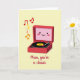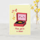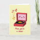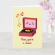 This card shows a red cartoon-style portable phonograph centred on a pale yellow background, its lid open to reveal a soft pink inside with tiny black eyes, rosy cheeks, and a small curved smile that feels warmly affectionate ❤️. A dark round record sits on the turntable with a bright yellow circle at the centre, and a thin tonearm reaches in with a red tip as if ready to play a favourite tune. Above it, musical notes float upward in red, yellow, orange, and pink, mingling with little star-like sparkles that suggest a sweet song shared between close hearts 🌼. The simple face on the phonograph gives it a friendly, companion-like presence, like it’s “looking” up at the notes with quiet delight. Near the bottom, the message “Mum, you’re a classic.” is placed in flowing red lettering, standing out clearly against the light background. The layout leaves plenty of open space around the illustration, keeping attention on the music and the gentle expression. The notes and sparkles rise in a loose arc above the open lid, with the brightest colours clustered closest to the top edge of the phonograph.