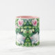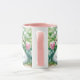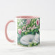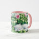 Personalised thermal coffee cup. Adorable white fluffy kitten sleeping under a pink rose bush watercolor ai art.