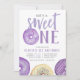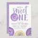 Cute first birthday party invitations feature "she's a sweet one" in the centre with your party details beneath, surrounded by watercolor doughnut illustrations in shades of purple. A sprinkle doughnut takes the place of the letter "O" for a cute and whimsical touch.