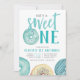 Cute first birthday party invitations feature "she's a sweet one" in the centre with your party details beneath, surrounded by watercolor doughnut illustrations in shades of aqua. A sprinkle doughnut takes the place of the letter "O" for a cute and whimsical touch.