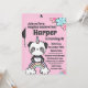 Celebrate a magical celebration with this adorable Panda Unicorn on top of a rainbow. The background is a lovely light pink, features pink and blue floral accents. Personalise to any party details.