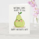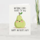 This greeting card features a friendly pear character centered on a creamy off-white background, drawn in soft green with a gentle highlight that makes it look rounded. The pear has rosy cheeks and closed, upward-curved eyes, giving it a sweet, affectionate expression that feels like a warm hug ❤️. A dark brown stem and a bright green leaf sit on top, adding a simple natural touch. Beneath the fruit, a muted pink shadow anchors it to the page without making the scene feel heavy. Across the upper area, the phrase “NOTHING COME-PEARS TO YOU” appears in a casual, hand-drawn sans-serif style in a dark tone, spaced to sit above the character. Near the bottom, “HAPPY MOTHER’S DAY!” is set in the same style and color, with the letters standing out clearly against the pale background 🌼. The overall layout stays uncluttered, with the pear aligned along the center vertical axis and the text balanced above and below it.