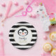 This sweet baby shower paper plate features a cute penguin face with long eyelashes, orange beak, and pink cheeks. The name of the mother-to-be appears in black calligraphy below, followed by "Baby Shower" and the date in faux gold san serif font. Beyond the faux gold circular frame is a background of black and white stripes. The ideal design for a black and white penguin-themed baby shower. See our collections for matching penguin baby shower supplies.