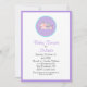White and purple baby shower invitation, with a lavender and aqua circle at the top, with a sweet pink carousel style elephant. A purple with white polka dot pattern, covers the back. Personalise all the text fields for your baby shower event.