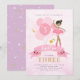 Personalised ballerina theme birthday invitation in pink and gold with starry purple back. Featuring ballerina in pretty pink tutu, simulated glittery gold wings and pink balloons. Sweet, girly, chic and elegant. Comes with front and back design. Customise with name, age and party details. Ballerina image options available. Perfect for ballet or fairy theme party.
