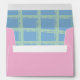 Adorable pink Holiday envelope with a cute little polar bear cub enjoying a cookie on the back and a blue and mint green grid pattern on the inside .