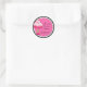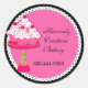 Pretty round stickers done in a black and pink pink background, with a decorative white scalloped frame. Colourful graphics of a cake stand full of cupcakes, decorate this too sweet bakery sticker. Text in black is ready to customise for your business. Great for bakeries, home bakers, and cake decorators, to use as seals to cake boxes and other packaging. Personalise for your business.