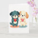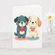 This sweet card features two adorable puppies sitting side by side against a bright white background, creating a balanced and heartwarming scene. The puppy on the left has a soft teal coat with darker ears and a tiny tongue peeking out, giving it a cheerful, friendly look. It holds a shiny red heart close to its chest. The puppy on the right has light beige fur with warm peach-colored ears and gently holds a soft pink heart that matches its calm expression.