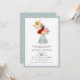 This graduation party invitation design features a watercolor painting of a girl with red hair with a blue dress and a graduation cap holding balloons, flowers and her diploma rolled up.
