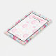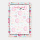 A yummy set of large sized sticky notes with a delicious pattern design. Glazed pink doughnuts with sprinkles. Mouth watering cupcakes in pink and blue with rosettes and strawberries on top. Some pastel pink french pastry macarons and little pink candy buttons also decorate this pattern full of sweet treats. A semi- transparent overlay islayered over top so you can write legibly over the pattern design. Text at the top says "sweet reminders" and can be changed / personalised to your liking.
