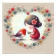 This charming design shows a sweet little girl in a red dress gently interacting with a bright red bird, framed by a delicate heart-shaped wreath of colorful flowers. The soft textured finish, storybook style, and cheerful mix of pink, blue, red, and cream create a warm, playful look that feels tender and inviting.