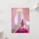 A beautiful party ballroom with teen girl wearing a gorgeous pink and white ruffled gown. The room is decorated with pink curtains, elegant table and chairs for guests, sparkling chandelier, pretty bright lights. Back of card has beautiful, delicate fairies.
