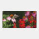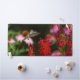 A hummingbird approaches a cardinal flower in a vibrant garden. The dark green background serves to highlight the bird and flower blossoms.