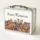 This is a standard metal lunchbox that appears to work just fine. We designed this box ourselves with an uploaded photo and custom text on the front and back. It looks absolutely beautiful except the front of the lunchbox is not centered like it shows in the photo. The print borders don't align with the inset flat part of the box where the preview photo online showed it perfectly centered in there. The back looks nice and centered though.