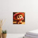 This image shows an adorable baby monkey wearing a red straw hat with pink flowers. The monkey has large, expressive eyes and a sweet smile as it holds a red and white lollipop. It is dressed in a red dress with a white button. The monkey is sitting on a wooden surface.