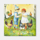 A vintage Easter magnet with an illustration made of Swedish painter Jenny Nyström. The illustration show a little boy and a girl with roosters, chickens and hens on a spring meadow. The illustration is in the public domain.