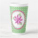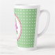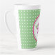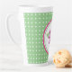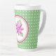 Designer latte mug in green with white polka-dot pattern, and a large single pink flower bloom, text can be added to personalise. The soft green background can be switched to any colour, as well as the large circle frames.