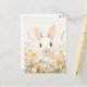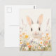 This enchanting postcard features a precious white baby rabbit peeking out from a lush field of vibrant wildflowers. The artwork is rendered in a soft, airy watercolor style, utilizing a delicate palette of apricot orange, peach, and soft violet against a clean, off-white background. The rabbit’s large, expressive dark eyes and gentle pink-toned nose add to the irresistible charm of the scene. With its cheerful botanical details and peaceful vibe, this piece perfectly captures the quiet joy of a spring garden sanctuary. This postcard is a perfect choice for sending a heartfelt hello, a sweet birthday wish, or a gentle "thinking of you" note to any animal lover.