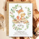 Cute watercolor woodland baby shower featuring an adorable mum & baby fox with pine branches with pinecones with a tan burlap background. Perfect for a boys baby shower or gender neutral baby shower