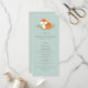A lovely little fox is nestled all snug on a bed of leaves and branches in this sweet illustration by Kat Parrella. With a soft grey teal background, the colour scheme is neutral in this program card that is just perfect for a rustic, chic country, or popular woodland animal themed event.