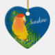 Pay tribute to your little buddy with this sweet lovebird ornament. A lutino peachfaced Agapornis Roseicollis sits at perky attention in all his yellow feathered splendour. Add your bird's name for a personalised heart shaped keepsake of your adorable forever friend. Parrot owners will love this trinket of avian affection to display on their tree or year round in a special spot for a sprinkle of birdie joy.