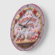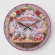This appealing circular wall clock features a dimensional illustration of a candy display perfect for Valentine's Day. The central motif showcases jars filled with pastel pink and blue candies and brightly wrapped small gift boxes on a wooden shelf. A small figure of Cupid is positioned centrally among the sweets. The words "SWEETHEART CANDY CO." are written prominently in pink script above the display. The design is elegantly framed by a wreath of pink roses and pearl-like decorative elements, all rendered as a highly detailed print.