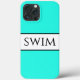 This fun sporty design features SWIM text inside a wide white center stripe against bright aqua background. The text and colors can be personalized.