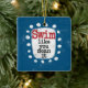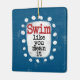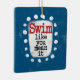 A cute typographic swimmer design that says "Swim Like You Mean It". It features black and red text on a white rectangle with funky, playful white dots surrounding it, all on a blue background.