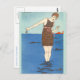 Art Deco style Illustration by George Barbier of a Young woman wearing a swim suit with a high-waisted ribbon bow and matching bathing cap. She is standing ankle deep in the ocean clutching a small crab in her left hand.