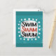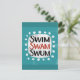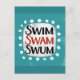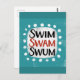 "Swim Swam Swum" is a fun text design with a white accent shape surrounded by white whimsical textured dots.