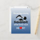 The inspirational text on this postcard is in white with a red heart; there is a deep blue background with the pictogram of a swimmer. "When your lungs are bursting and your legs can swim no further SWIM WITH YOUR HEART."