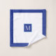 Swimmer icon on a blue circle swimming bath towel set that displays apattern of a minimalist white icon of a swimmer on a two tone blue circle-sea and sky and around it a blue border. The washcloth is white with your monogram while the hand towel includes a two tone blue striped pattern.