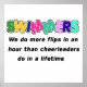 Swimmers in colourful letters and the words We do more flips in an hour than cheerleaders do in a lifetime