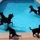 Silhouetted dogs playfully leaping and splashing in a bright blue swimming pool.