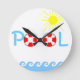 Great for the swimming pool deck. White wall clock with red life preserver rings "Pool Clock" is perfect for your summer beach home or backyard pool. Makes a wonderful gift for someone special! IF YOU CHANGE THE SHAPE OR SIZE-PLEASE ADJUST IMAGE AND TEXT TO FIT NEW SIZE!