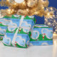 This fun Christmas in July wrapping paper makes a perfect sunny party gift wrap for a pool gathering. Make it a fun north pole themed extravaganza with Santa Claus in his swimming trunks next to a cool swimming pool and diving board. Jolly Saint Nick is drawn in a red bathing suit on this cool blue napkins.