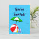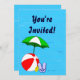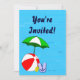 Custom party invitations with a fun swimming pool theme, decorated with a red beach ball, green umbrella, sandals and suntan oil on a watery blue background with curly waves. Click Customise It to change fonts or colours.