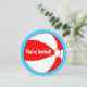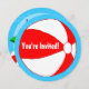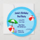 Custom round party invitations with a fun letters and a swimming pool theme, decorated with a red beach ball, green umbrella, sandals and suntan oil on a watery blue background with curly waves. You can change fonts or colours, even save your design for later.
