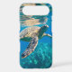Underwater photograph of a sea turtle swimming in crystal clear water just below the surface.
